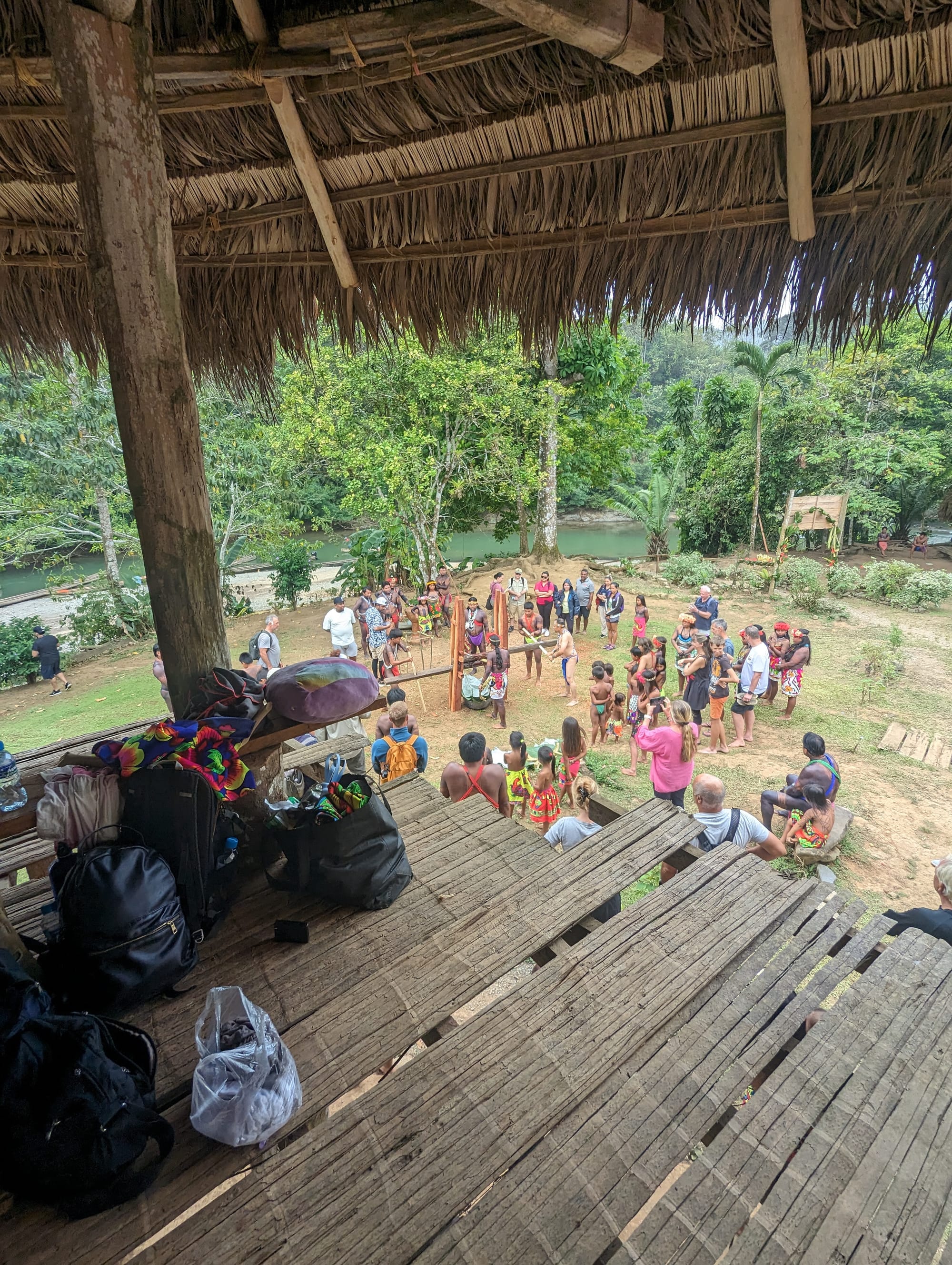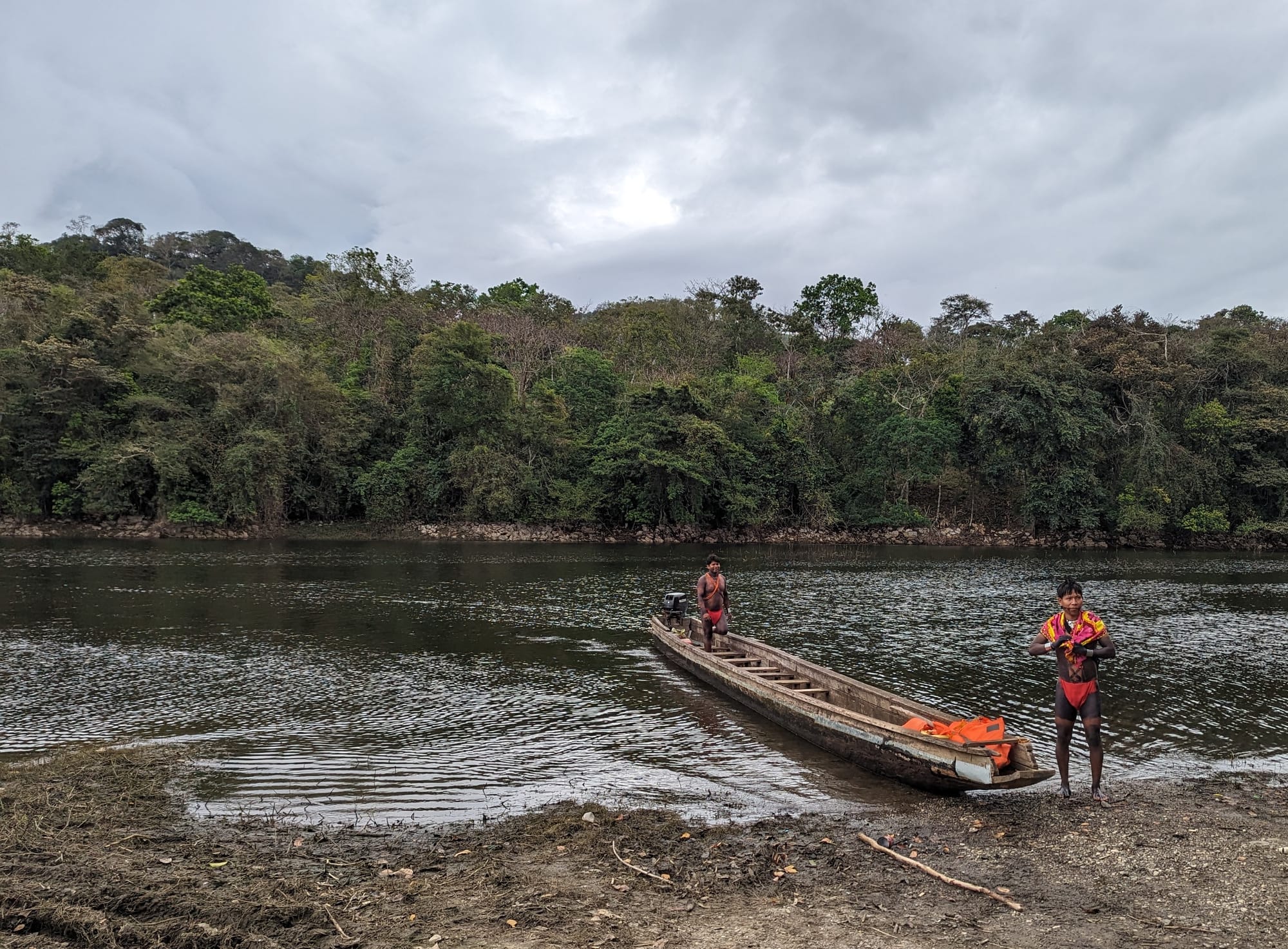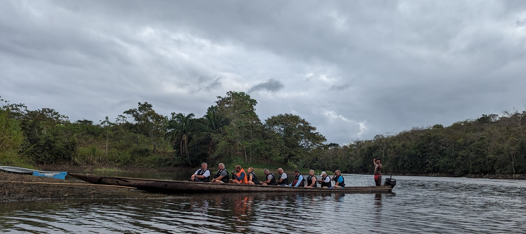An early bus ride took us through the interior of the country. We were dropped off at a point along the Chagres River (the river that was dammed to create Gatun Lake for the locks of the Canal). Waiting for us were six dark-skinned men wearing brightly colored, long and loose-fitting loin cloths, as well as three dug-out canoes, each about 15 feet long and kitted with a 25 hp outboard (authenticity only goes so far!)