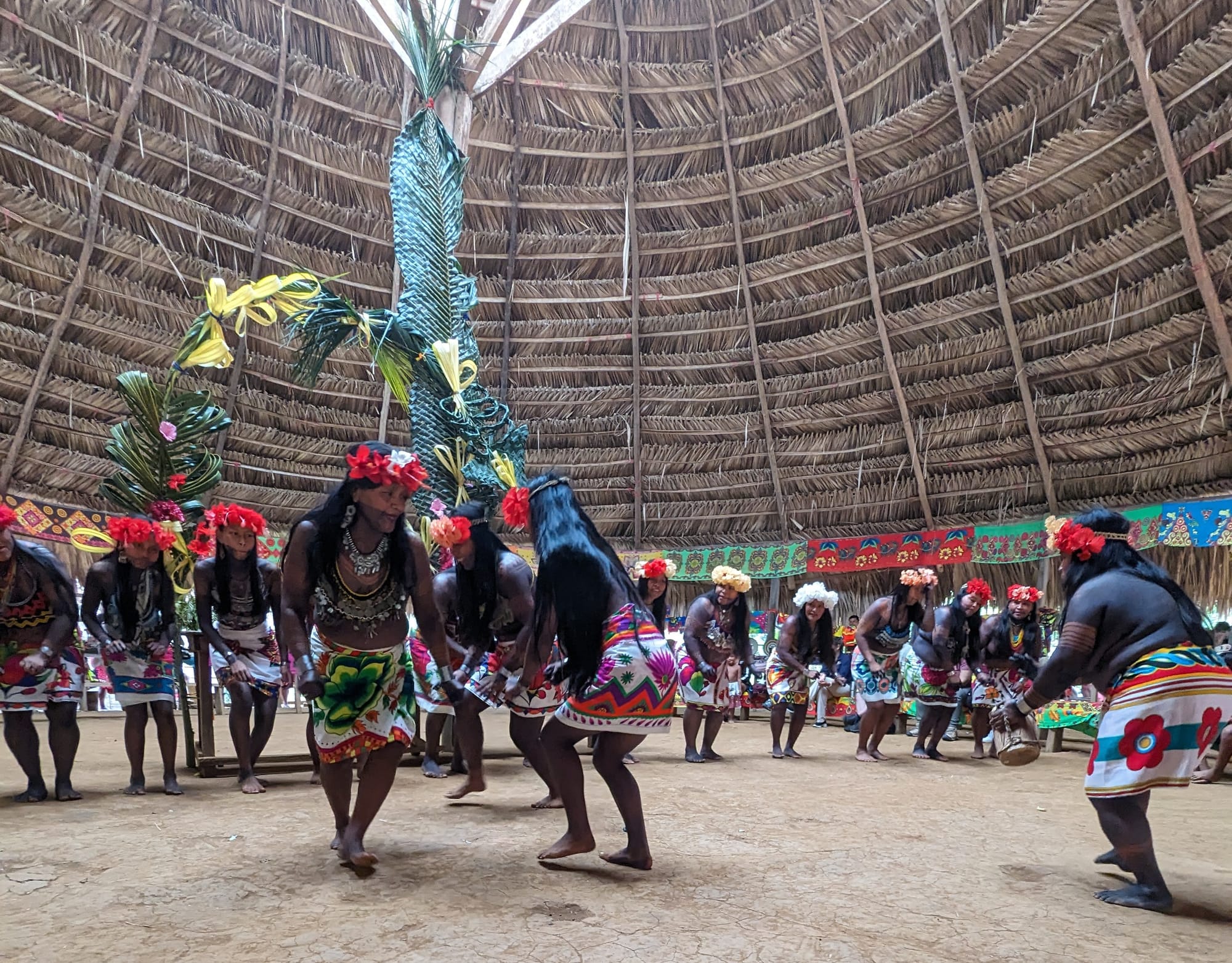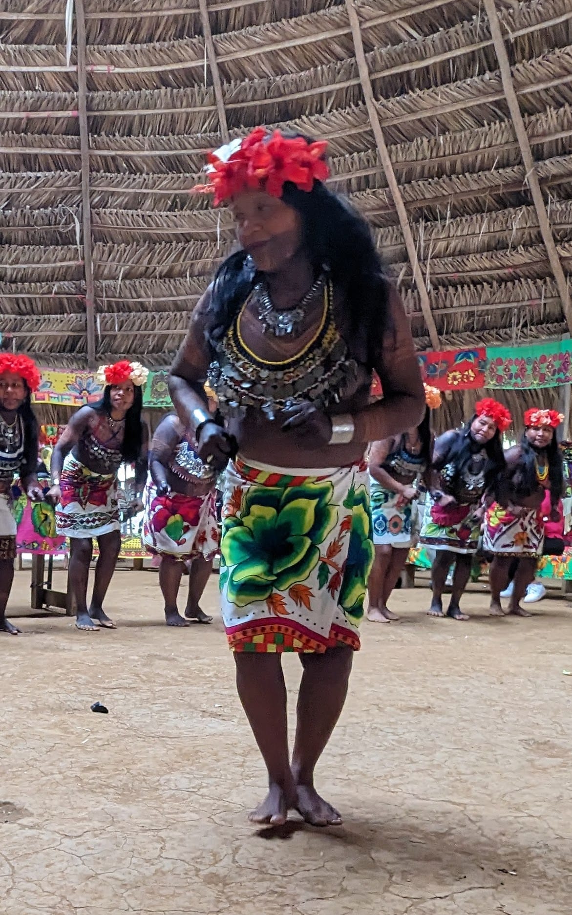 We were led from the bank to a very large, open thatched hut which boasted an intricately woven roof constructed of reeds. The chief’s representative welcomed us in the native tongue of the Embera. He then proudly spoke of Embera history and culture in Spanish, which was translated by our guide Clemente. “Ba-bu’-e” means “thank you” in Embera, and we used it many times to express our appreciation for their hospitality.