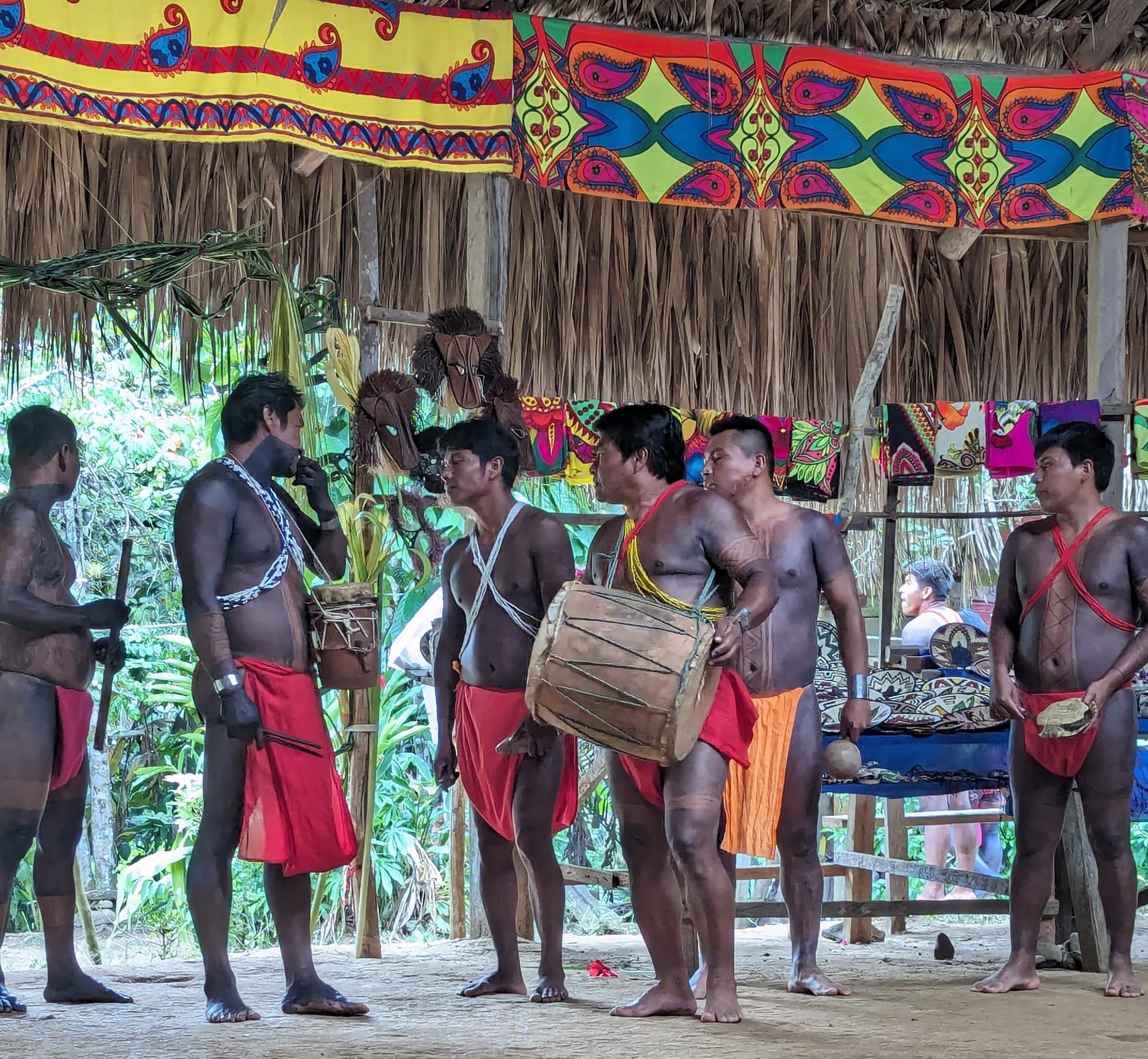 All too soon we disembarked onto a rocky shore and were greeted by the sounds of drums and singing. Along the bank were the men, women and children of the Embera tribe in full traditional dress. It was like going back in time! My first impression of the people was that they were of African descent because their skin was so dark. We were soon to learn that they are dark because they are tattooed from head to toe (painted on ink, no needles!). Some villagers were completely dark, while others sported elaborate designs of the wearer’s choice. Not only decorative, but the paint also serves as an insect repellent!