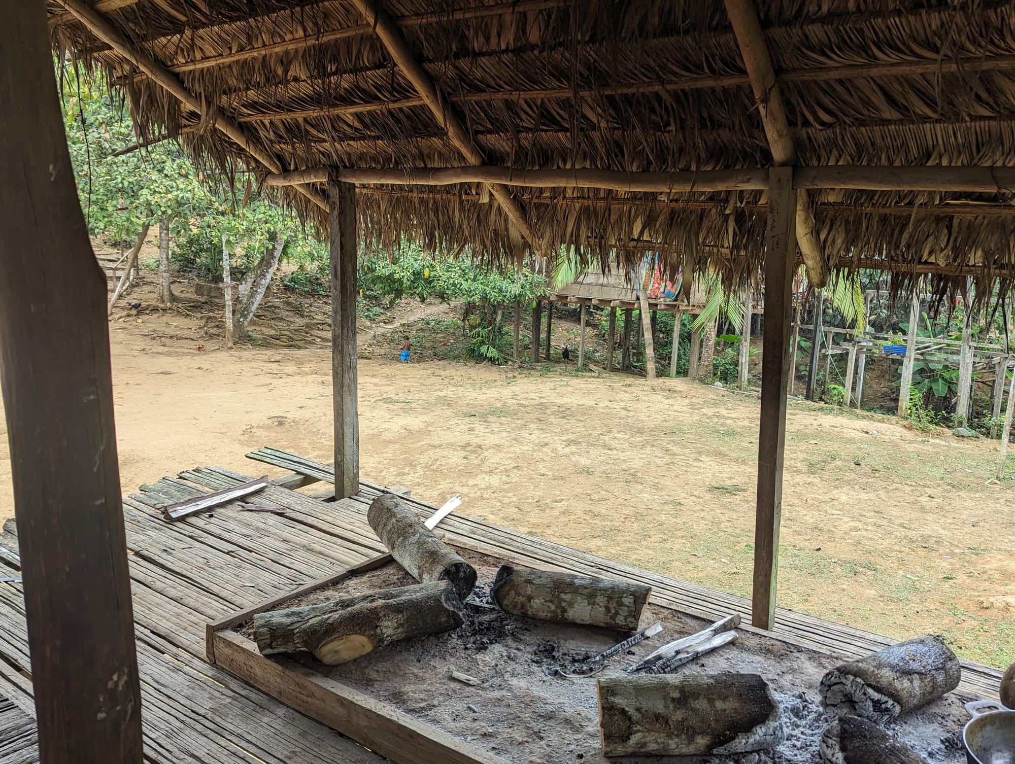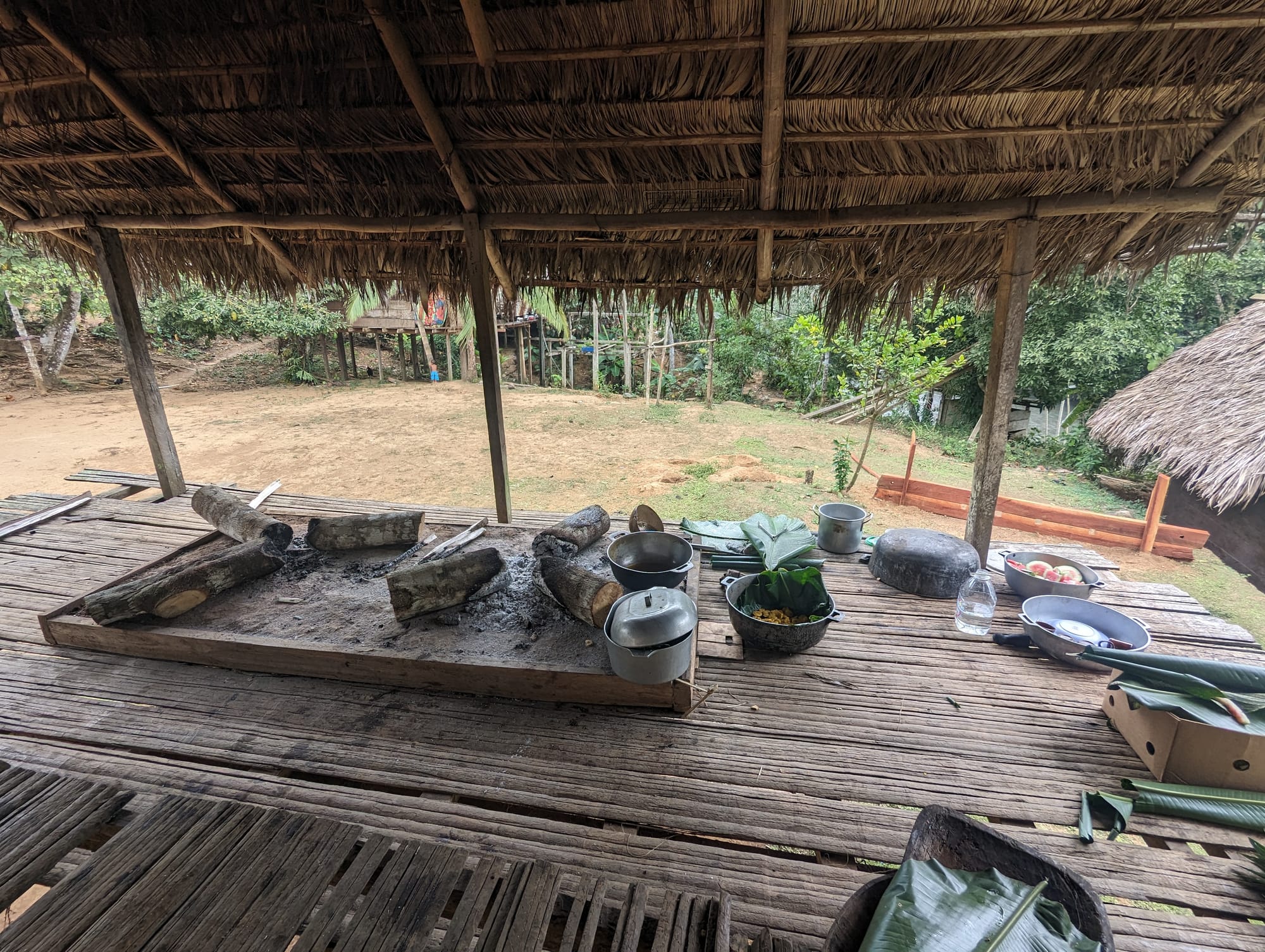 The kitchen where all this food had been prepared was on the raised floor of a nearby hut. To get there required climbing 15 steps (that had been hewn along one side of a log) to the plank floor. At the end was an area with hot charcoals and large metal pots (like woks) that were holding hot oil. Hard work, but the results were very tasty!