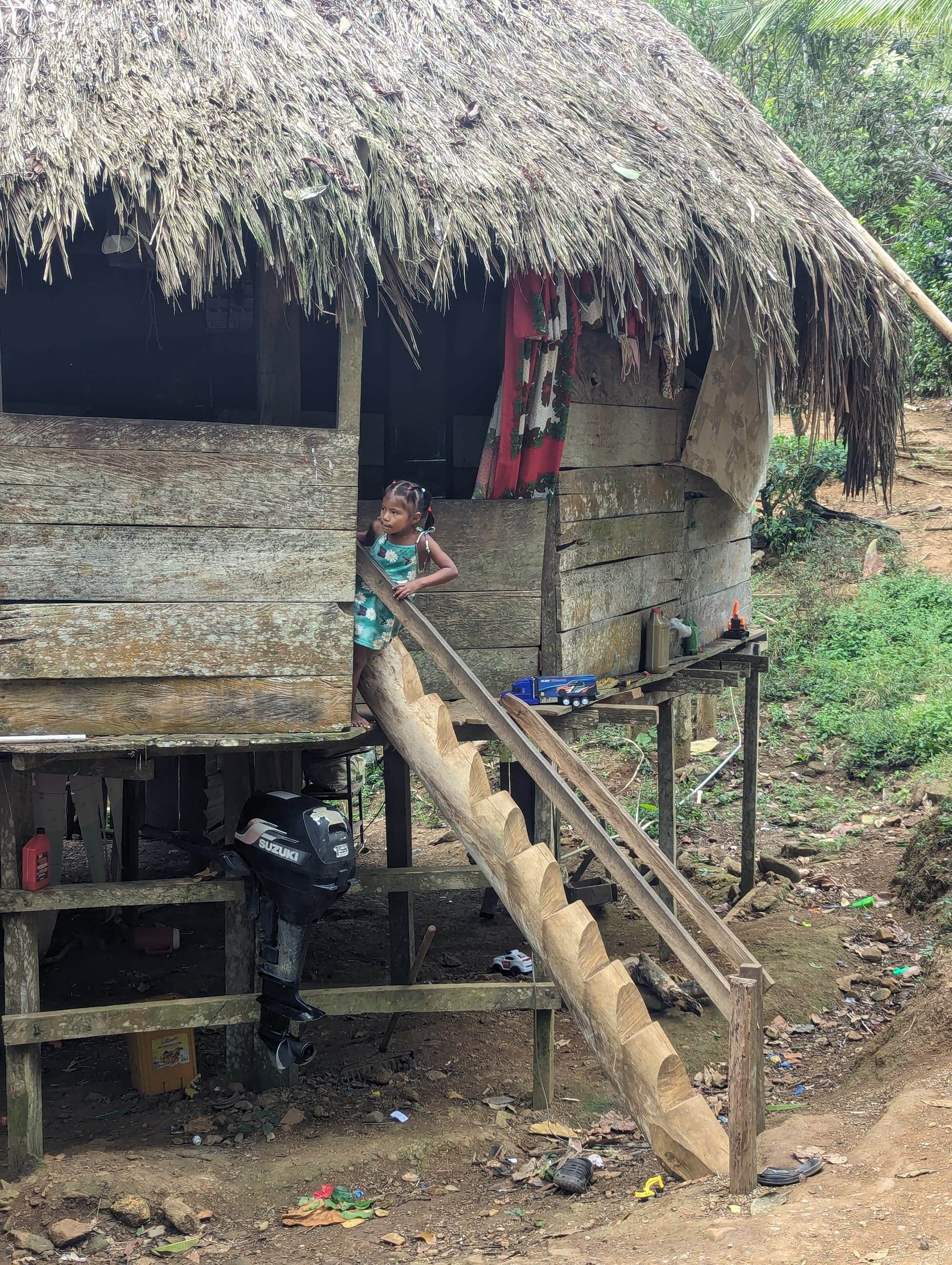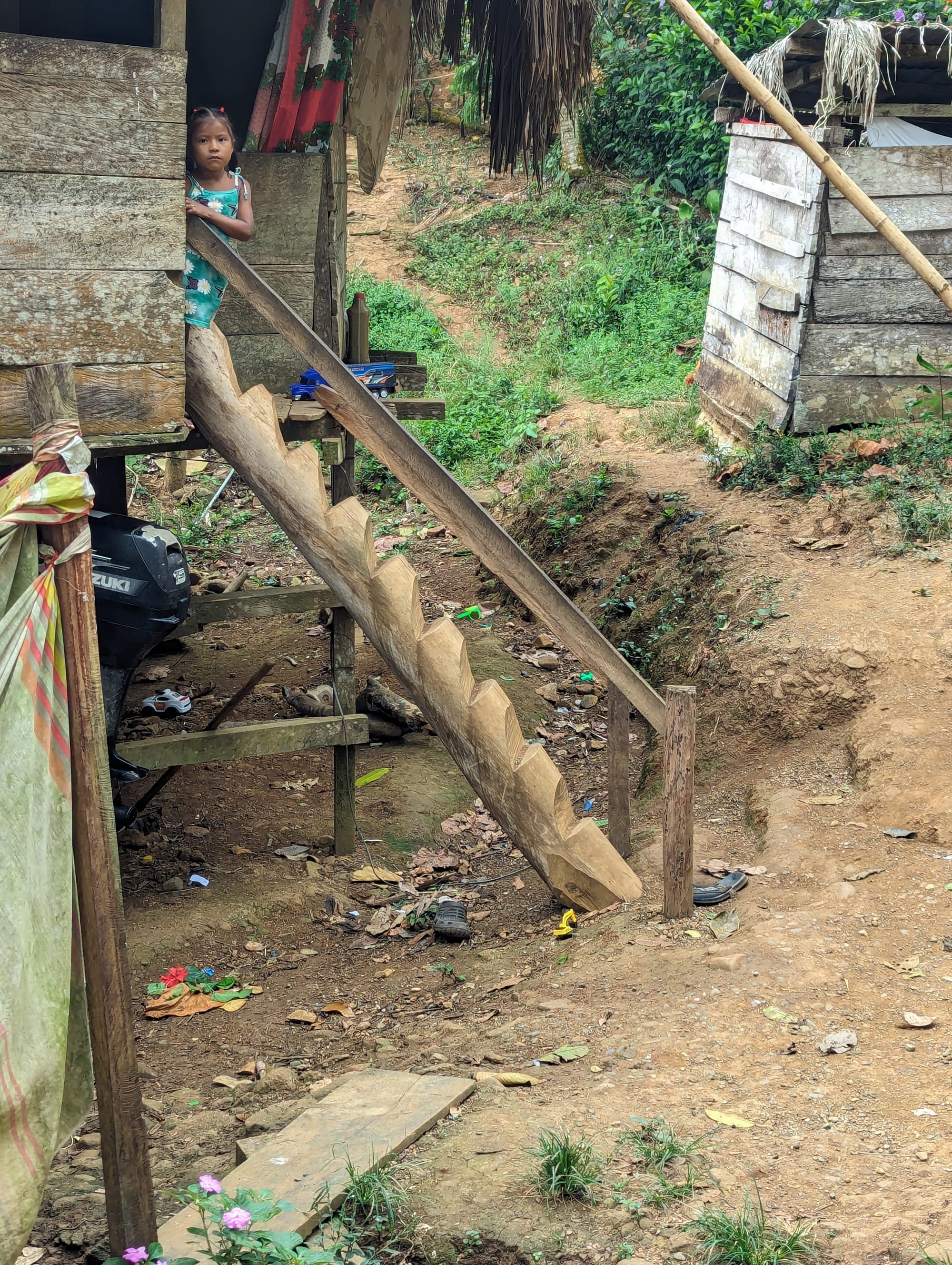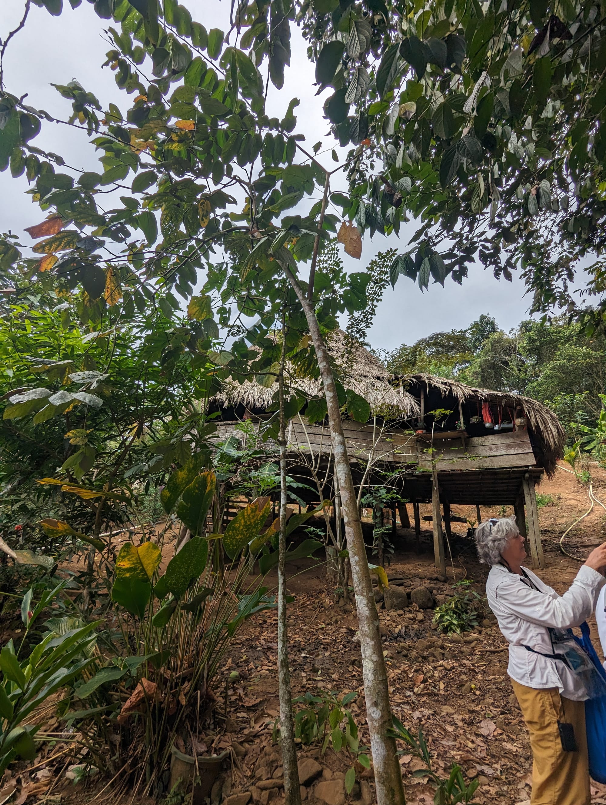 After lunch we were treated to a walk through the jungle surrounding the village. Along the way we saw that the people lived in huts on stilts with thatched roofs, and with those “log steps”. Small children were happily chasing chickens around; the older ones were a bit shy, but friendly.