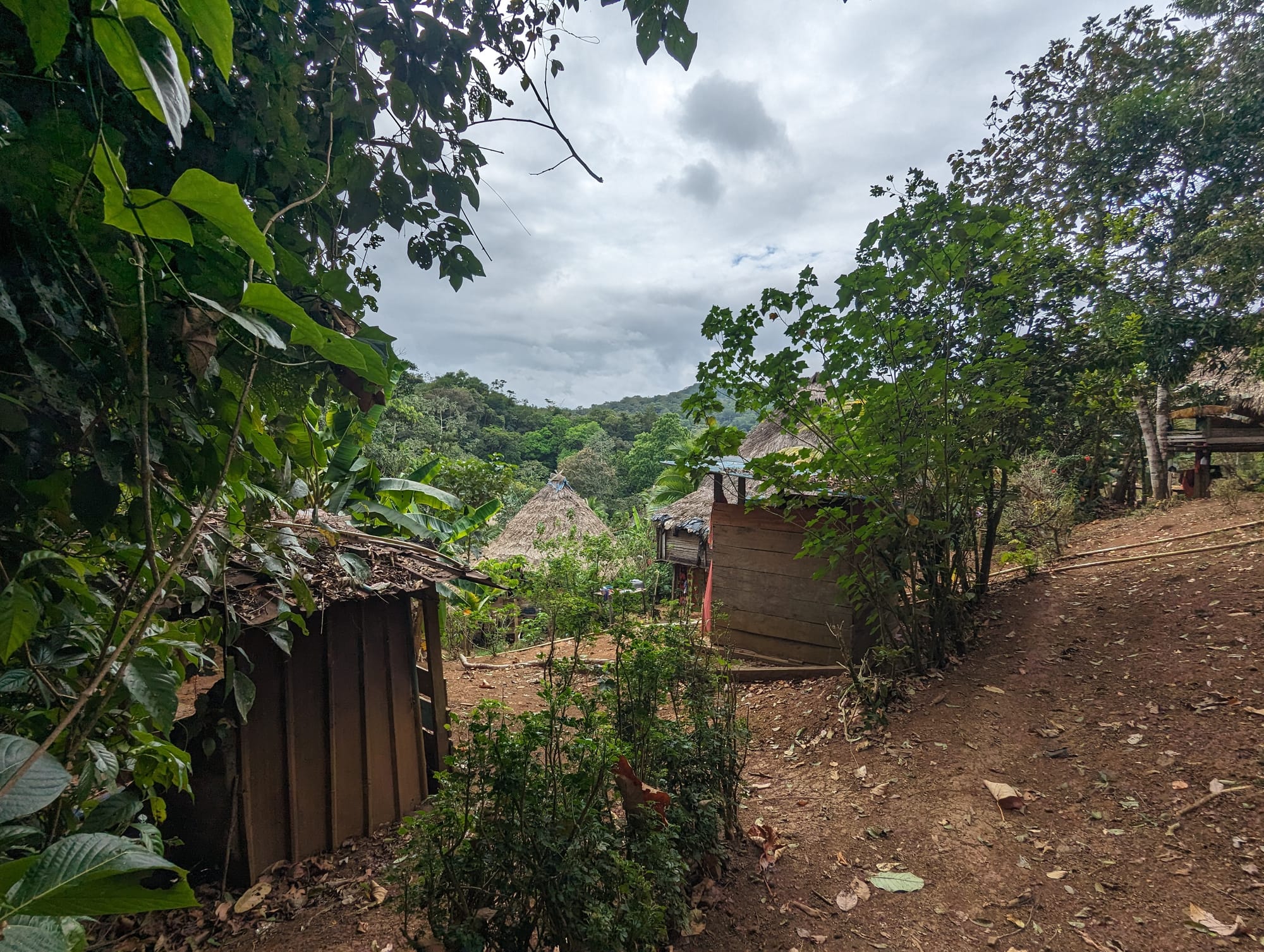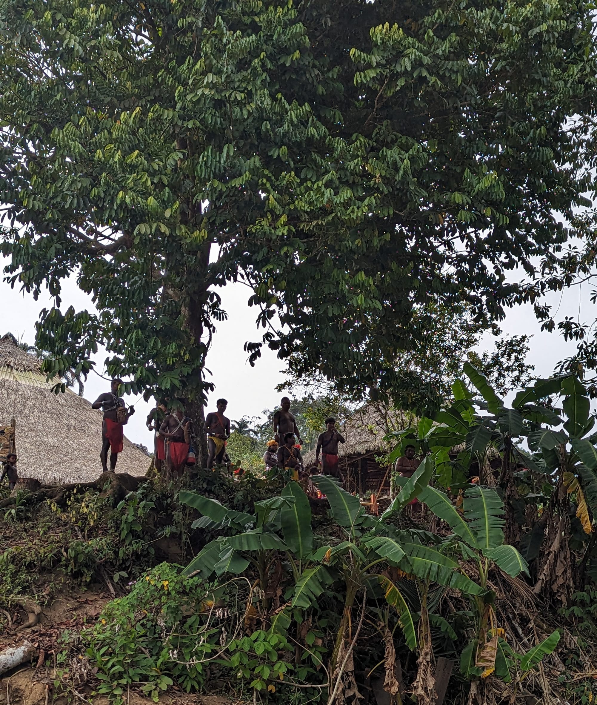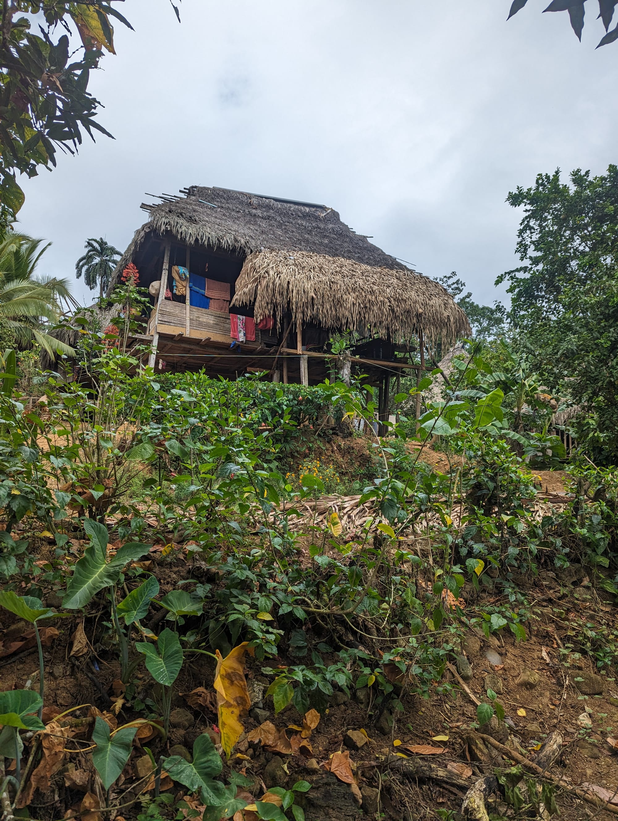 After lunch we were treated to a walk through the jungle surrounding the village. Along the way we saw that the people lived in huts on stilts with thatched roofs, and with those “log steps”. Small children were happily chasing chickens around; the older ones were a bit shy, but friendly.