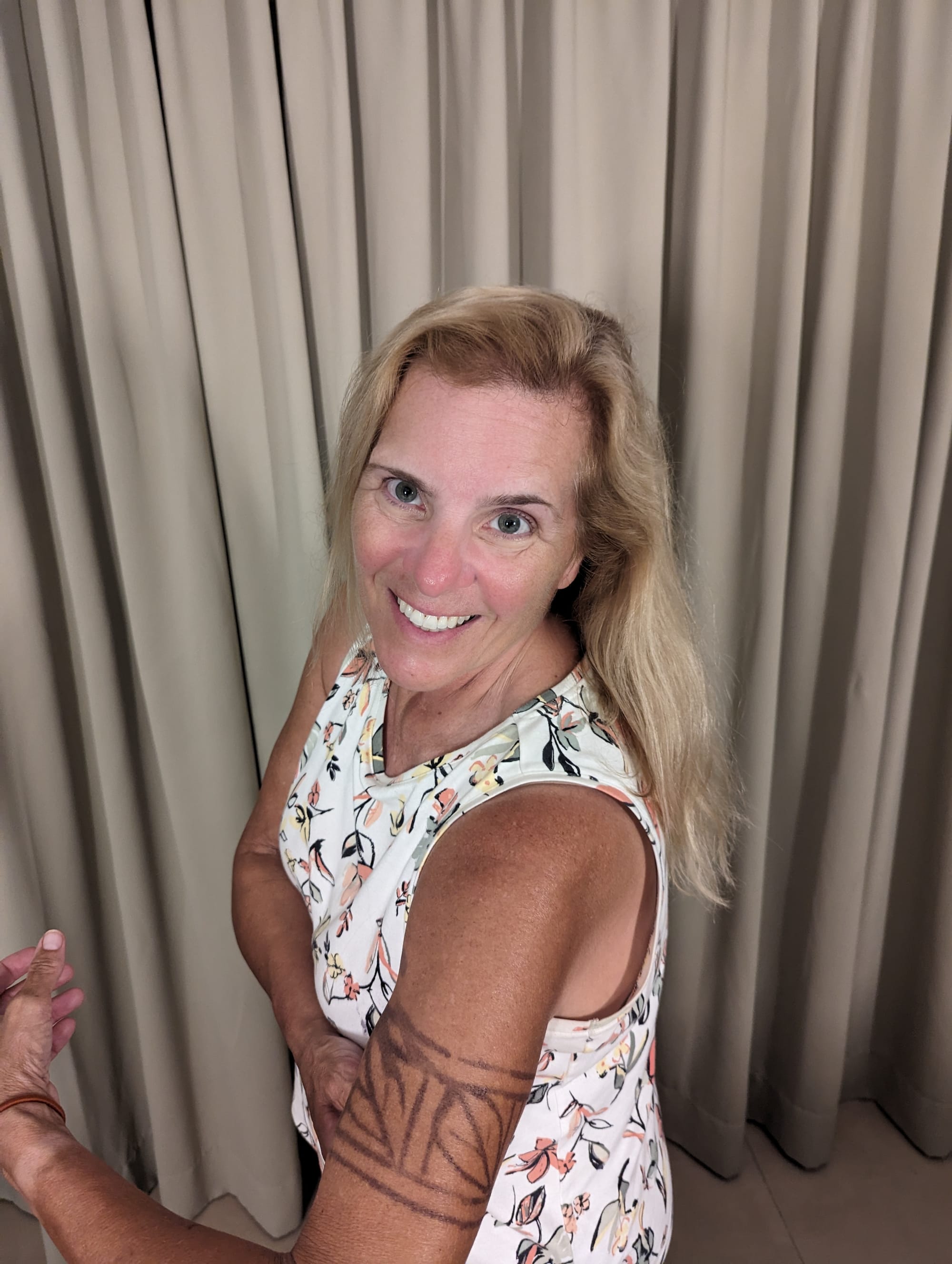 Back in the village, we were invited to browse the handmade crafts offered for sale. The community hut was ringed by tables covered with jewelry, painted fabrics and carvings. Each family had its own table of handiwork of which they were quite proud and happy to sell. In fact, it was the only time I saw any of them smile. I bought a few things, and got a tattoo on my left bicep…a temporary but fond reminder of our day!