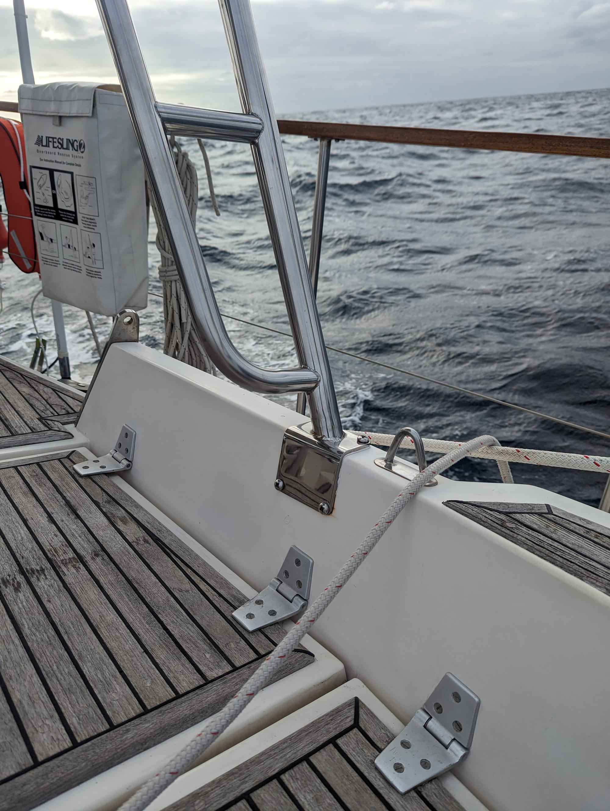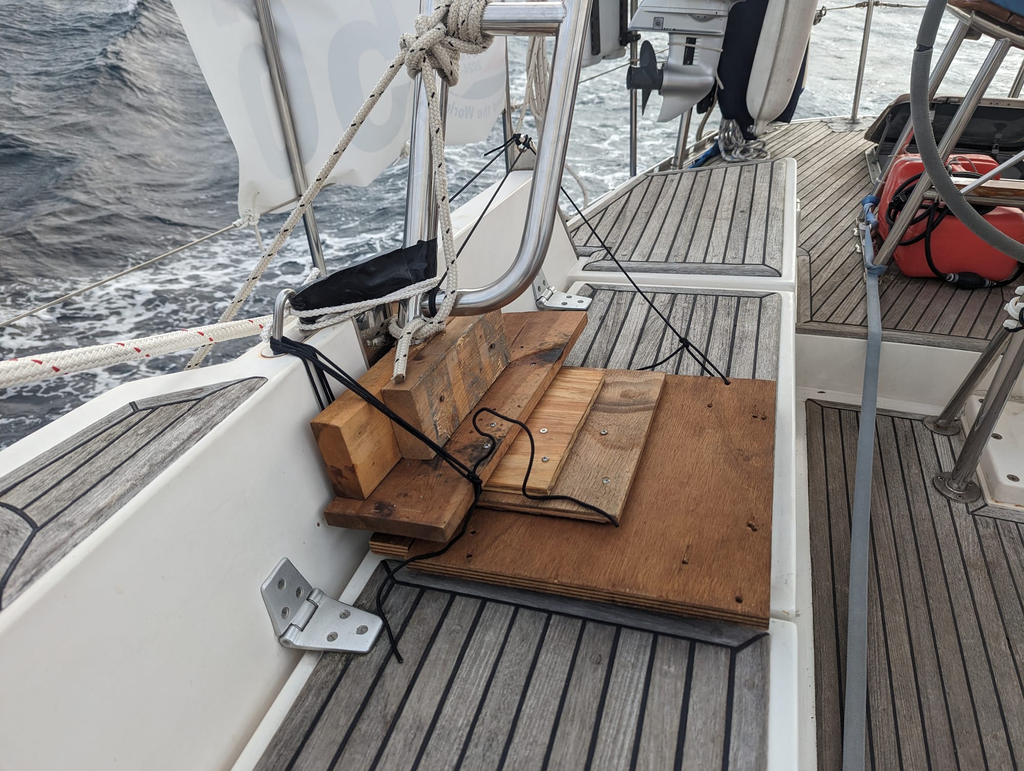 Our hardtop (which holds our solar panels and communications gear) is connected to the boat with 6 stainless steel arms. The weld of one of the arms failed during a gale (40 mph winds).