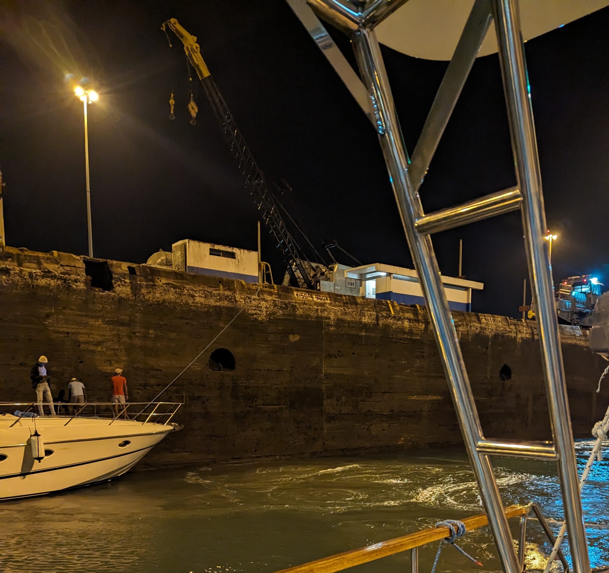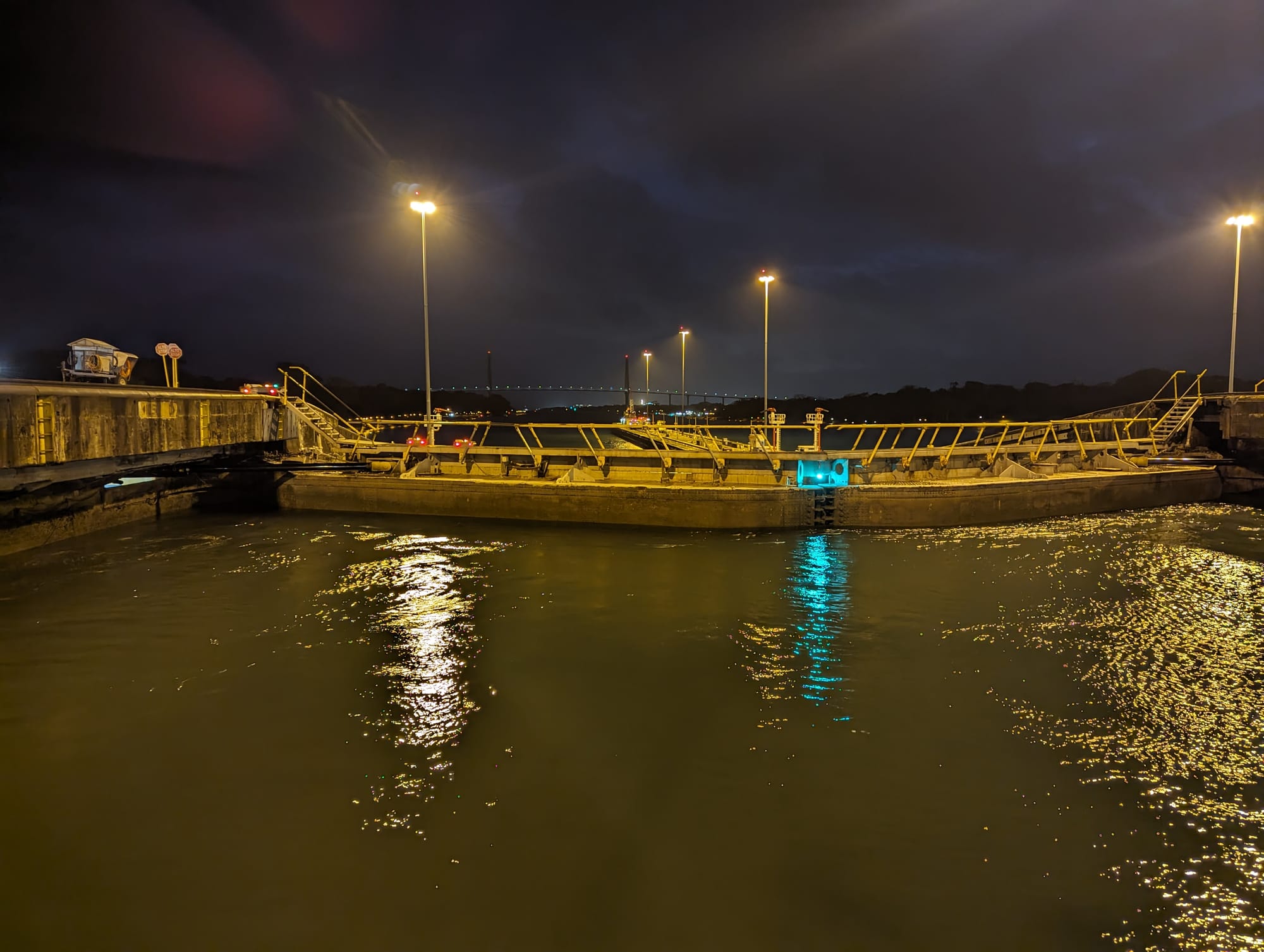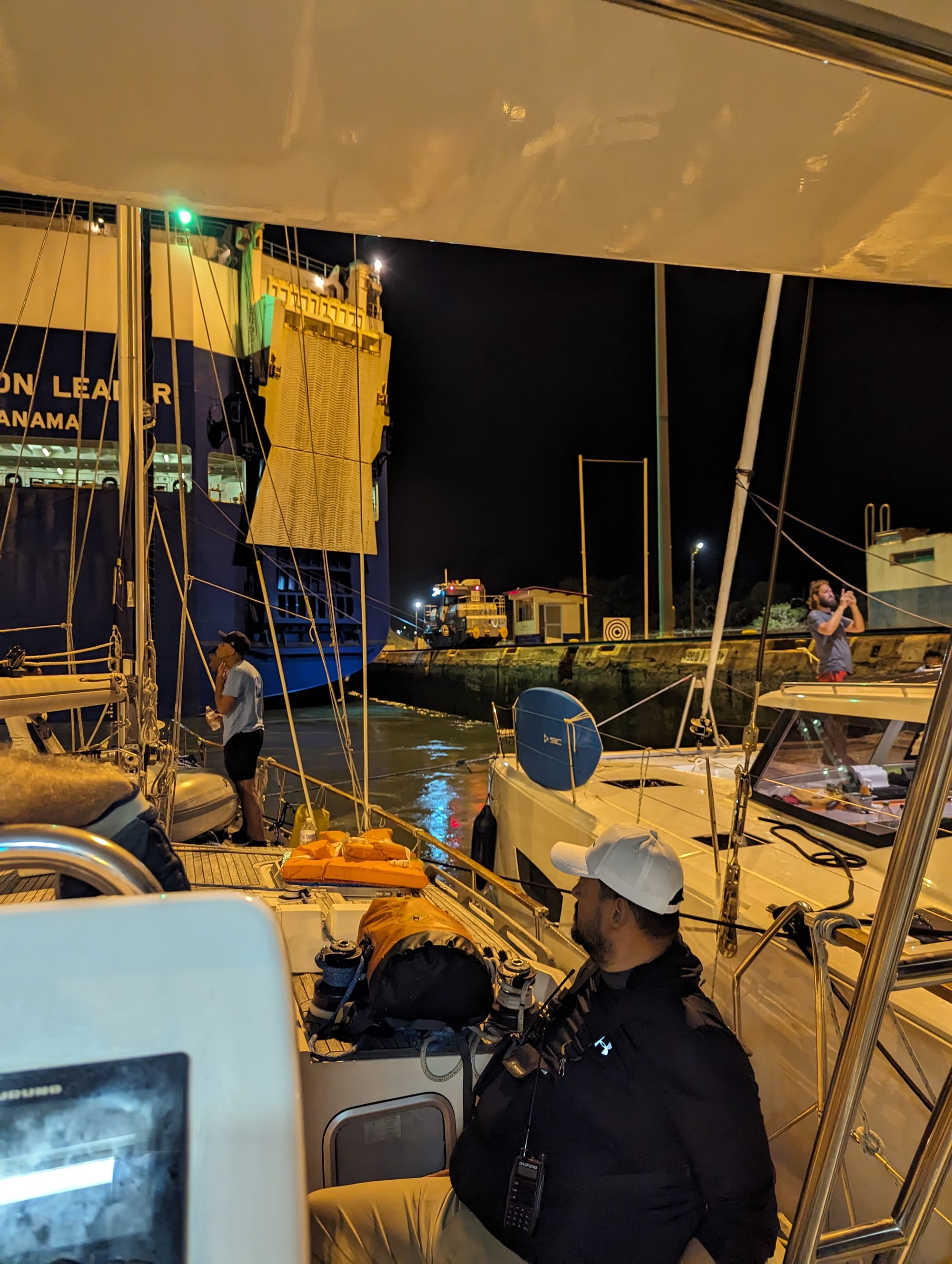 At 3:30 am we met Roy, our agent, on the dock who brought with him our three line-handlers, some heavy-duty lines and three massive ball fenders. We soon left our slip and made our way to our rendezvous point with our advisor in pitch dark conditions. It was a hectic start to the day, but once our pilot came aboard (~ 3:45 am), the tension began to fade, and the anticipation of the transit began to build.