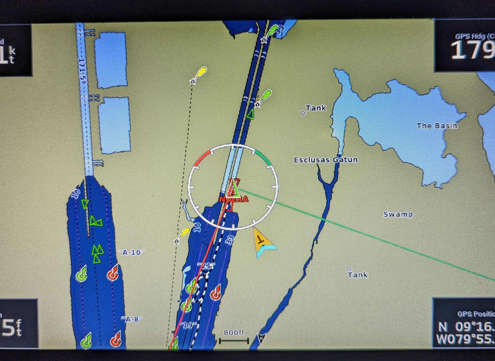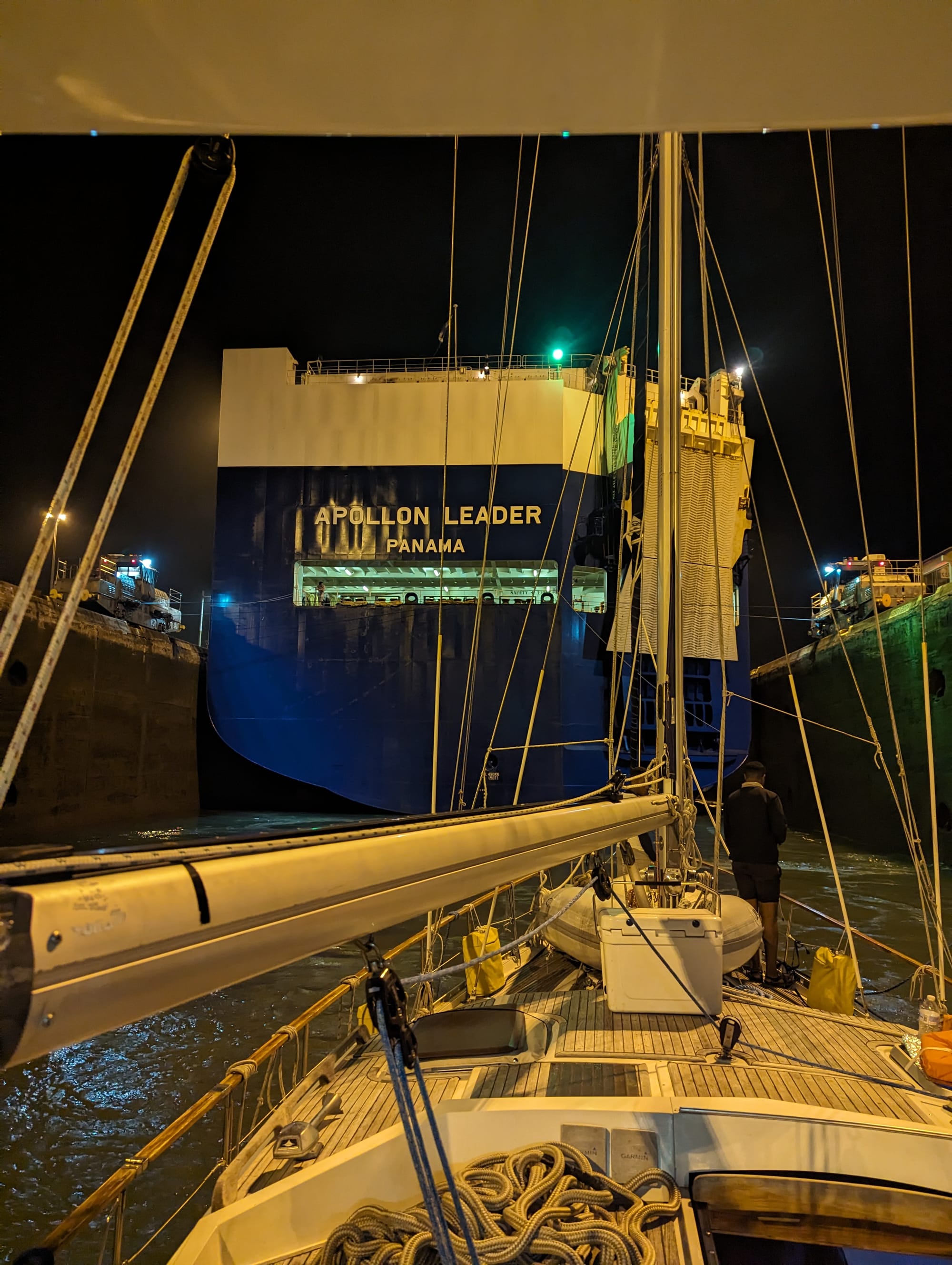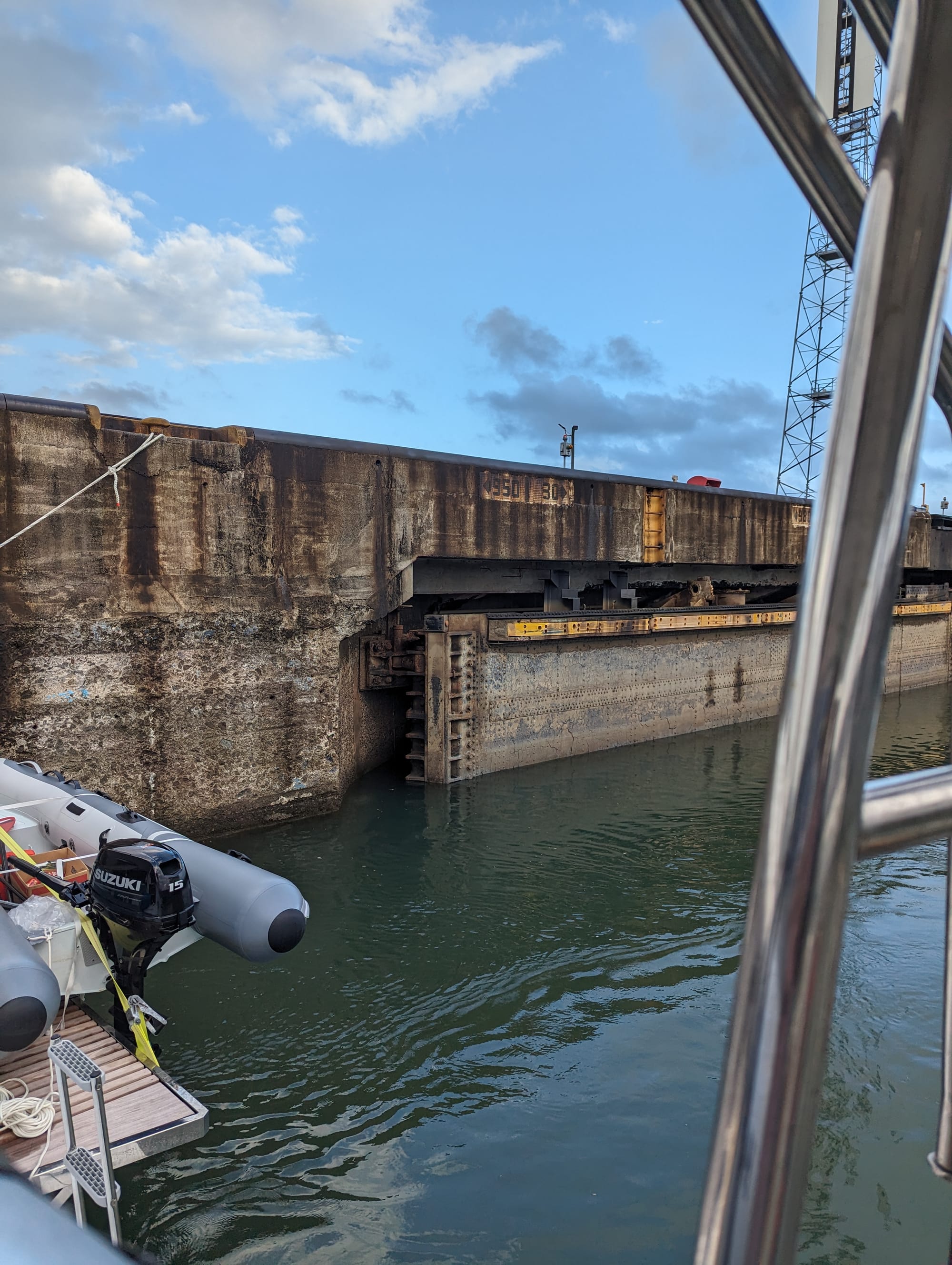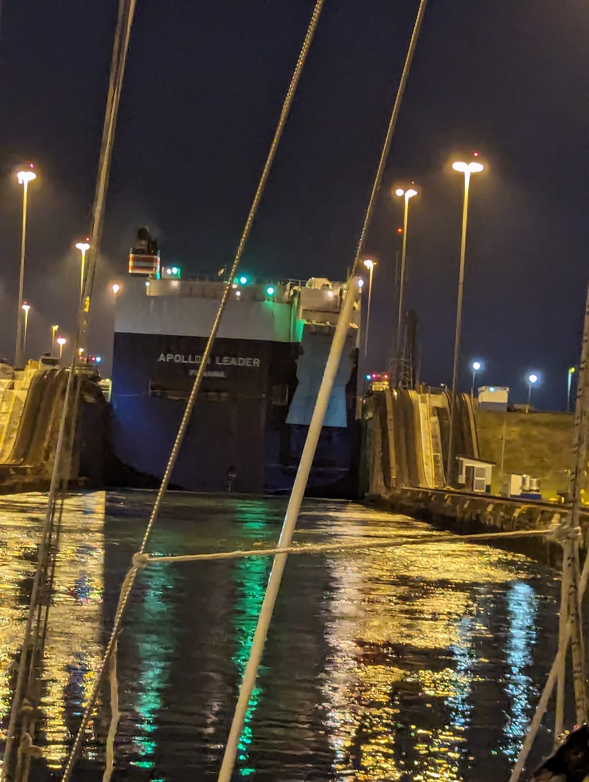 At 3:30 am we met Roy, our agent, on the dock who brought with him our three line-handlers, some heavy-duty lines and three massive ball fenders. We soon left our slip and made our way to our rendezvous point with our advisor in pitch dark conditions. It was a hectic start to the day, but once our pilot came aboard (~ 3:45 am), the tension began to fade, and the anticipation of the transit began to build.