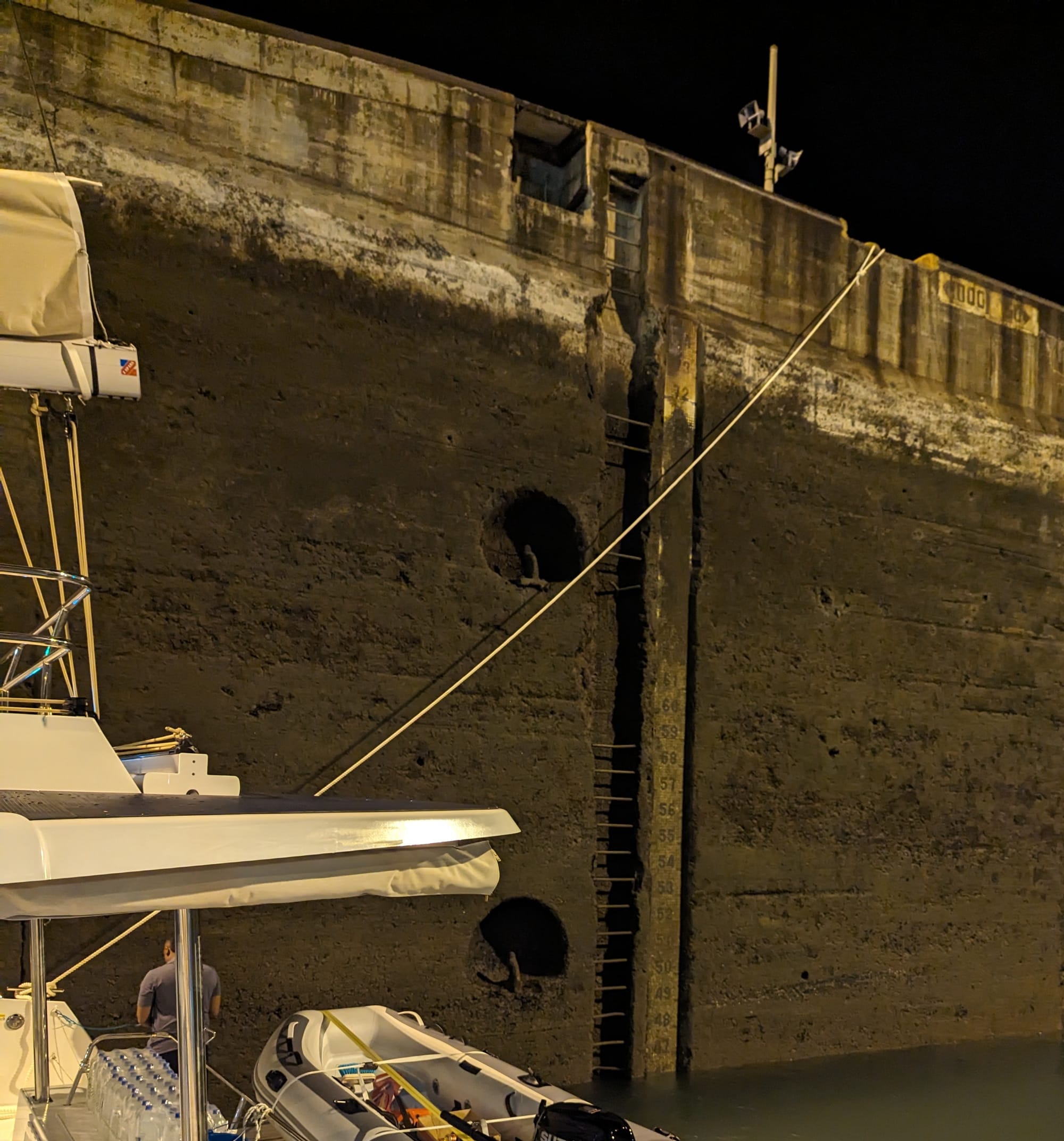 Our Canal transit was from the north to the south. Our journey would take us through the Gatun Locks (which has 3 chambers), then the Pedro Miguel Locks (which has 1 chamber), and finally the Miraflores Locks (which has 2 chambers). When we entered the first chamber, it was before sunrise and very dark outside with no moon. But we could clearly see the tall rough rock walls on either side and were thankful that we would not have to tie up next to that! Instead, we rafted to a catamaran which had opted to go next to the wall (that captain almost instantly regretted that decision since it required his constant attention to keep his boat from getting damaged).