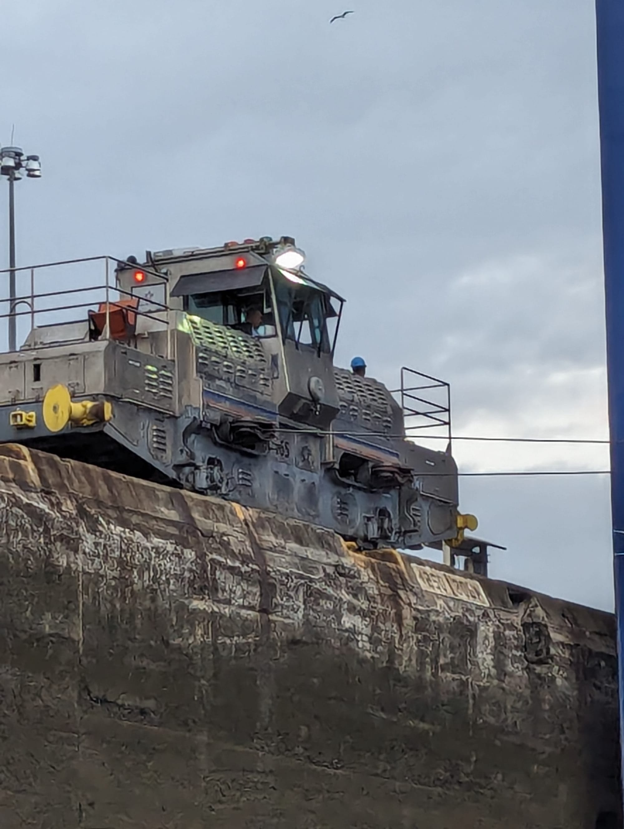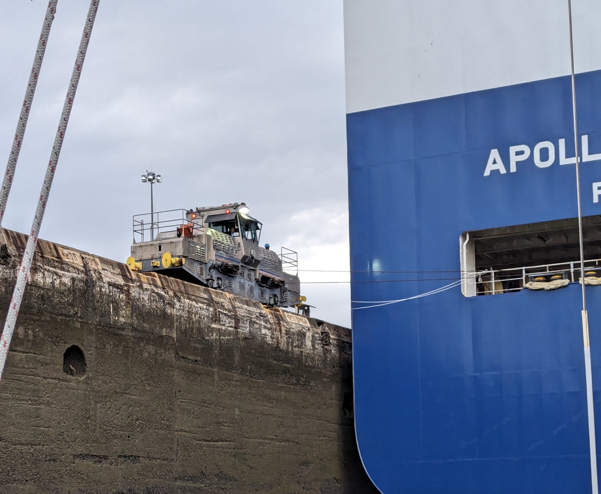 Ahead of us was an enormous "ro-ro" (a car carrier) Apollon Leader. She had about 3 feet of clearance to either side and was held in that spot by cables attached to special trains whose tracks ran parallel to the canal.