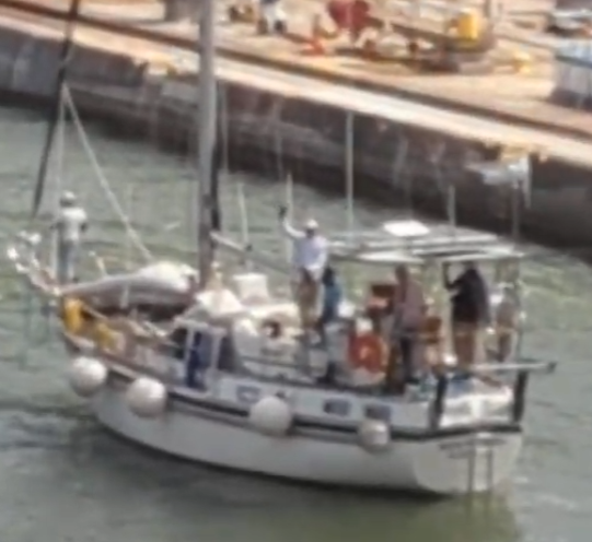 Not too far were the final Miraflores Locks, where once again we rafted with the ferry. We knew that Whitson was in the Viewing Building but could not see him as the ferry was blocking the view. So, Whit just waved at the building, hoping that he could see us!